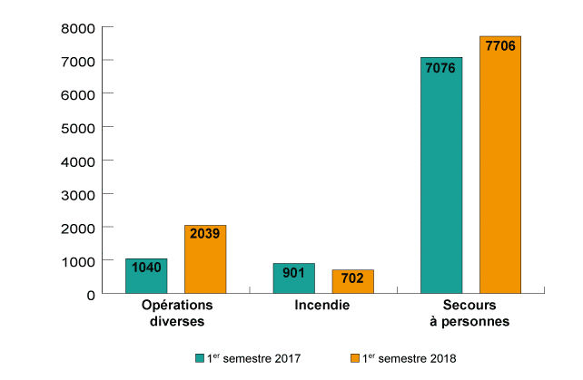 Au 30 juin 2018, le SDIS totalisait 10 447 interventions contre 9 017 sur la même période en 2017 soit une augmentation globale de l'activité de 15, 85% .