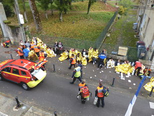 Une centaine de sapeurs-pompiers ainsi qu'une trentaine de véhicules ont été engagés au cours de la journée. Bilan fictif de cette intoxication au monoxyde de carbone : 2 morts, 6 victimes en urgence absolue, 20 en urgence relative et 32 impliqués. Les victimes étaient principalement "jouées" par les élèves de l'IRFSS de Vesoul, qui ont pris leur rôle très au sérieux, tout comme les élèves du lycée des Huisselets de Montbéliard qui ont été les premiers pompiers à secourir et extraire les victimes du théâtre. Cet exercice s'est déroulé sous l'autorité de la Préfecture de la Haute-Saône, en présence de madame la directrice de cabinet, et avec le concours des autres services en charge de la sécurité et des soins aux victimes, la gendarmerie, le centre hospitalier de Gray, le SAMU 70, le SMUR de Gray, l'ADPC et bien entendu la commune de Gray.