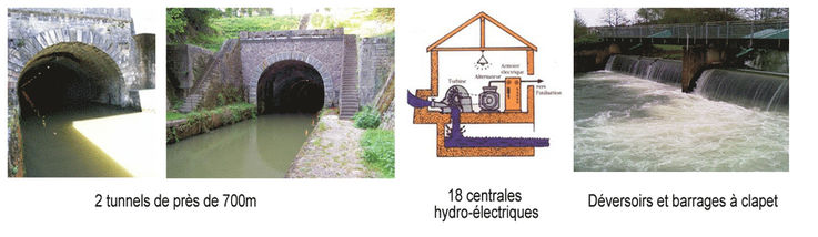 les voies navigables et les 28 écluses où circulent quelques 5 000 bateaux de plaisance et 90 péniches,