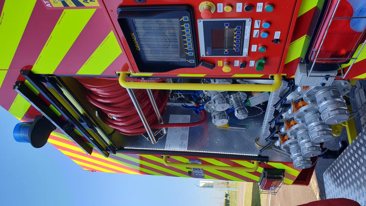 Ce véhicule, spécialisé dans la lutte contre les feux d’aéronefs, est seul capable de combattre efficacement un incendie de cette nature, grâce, notamment, à un canon commandable de l’intérieur de la cabine ayant une portée théorique de 70 mètres. Il dispose également de :