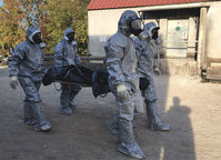 Il s’agissait pour le groupe « ramassage NRBC » engagé de se former à la prise en charge et à la décontamination de victimes suite à un incident chimique. Ce groupe était constitué d’une VL « chef de groupe », d’un FPT, du véhicule « poste de commandement » et d’une VL du SSSM.